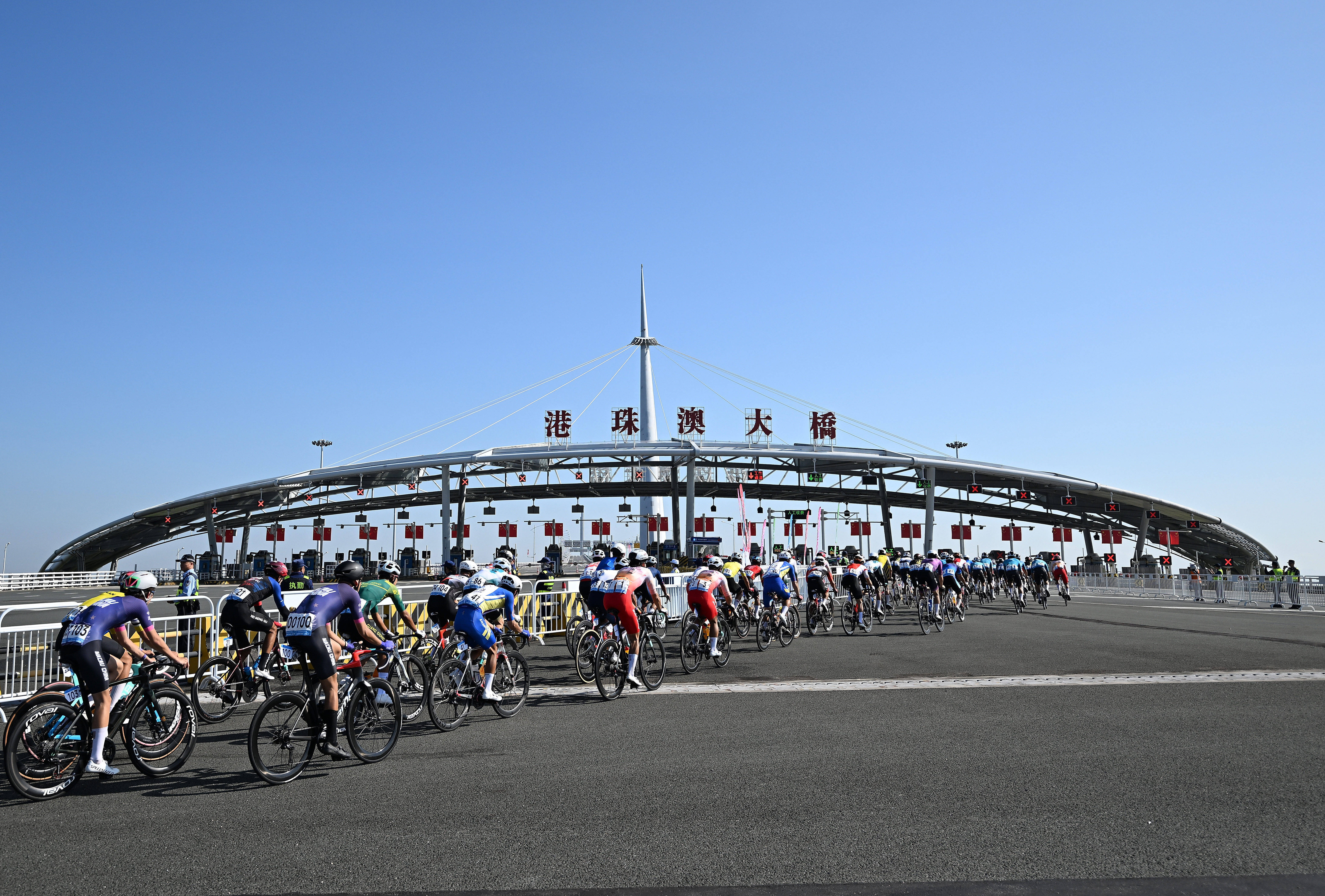 11月8日,第十五届全国运动会公路自行车男子个人赛决赛开赛,图为参赛选手经过港珠澳大桥。新华社记者 邓华 摄本届全运会,预计内地前往港澳参赛人员将超6000人、港澳来内地参赛人员将超3000人,便捷的通关将让参赛和观赛都能感受到“粤港澳路路通、大湾区一家亲”。