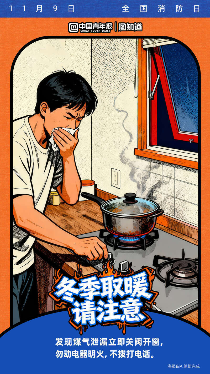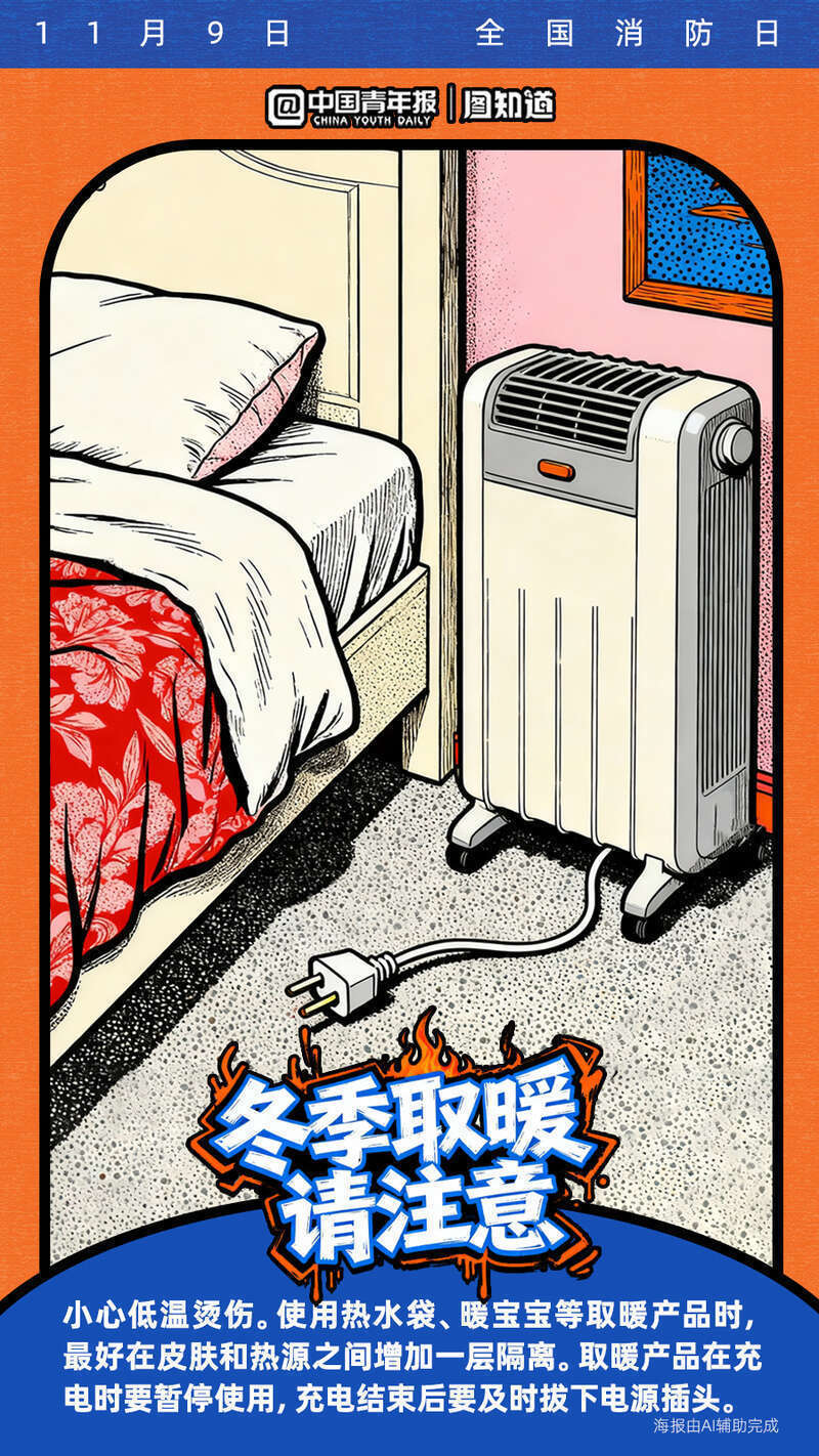 今天是11月9日全国消防日。寒冷的冬季已经到来,很多取暖器如果被不当使用将暗藏隐患!电热毯、取暖器等怎么用才安全?遇煤气泄漏该如何处理?收藏这份冬季取暖安全指南,速戳海报get消防安全知识点!
