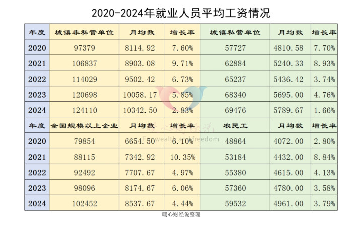 近年来,社会平均工资的增长速度开始放缓。从2020年以来,全国城镇非私营单位的工资增长率最高的是2021年达到了9.71%,私营单位增长率也是这一年,达到了8.93%。2024年城镇非私营单位的工资增长率是2.83%,私营单位是1.66%。